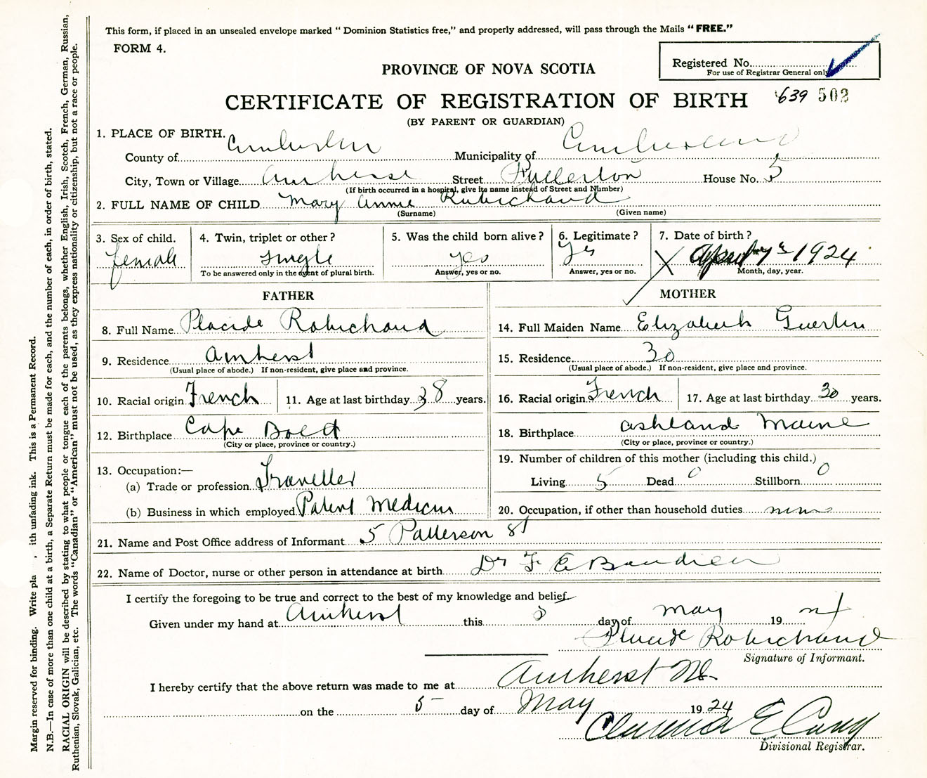 Female Birth Registration: Year: 1924 number: 63900502