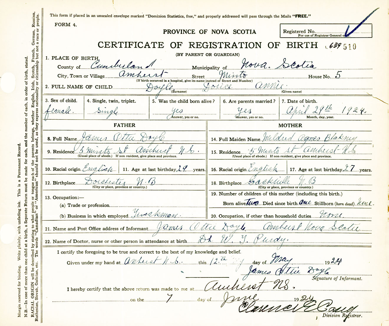 Female Birth Registration: Year: 1924 number: 63900510