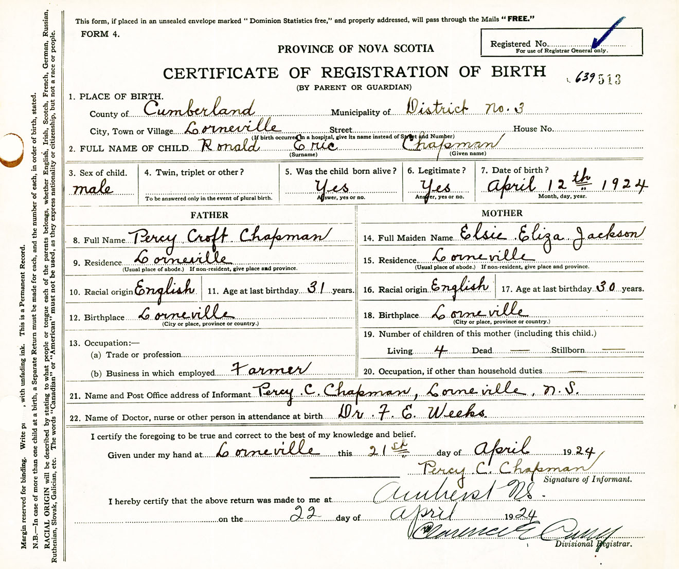 Male Birth Registration: Year: 1924 number: 63900513