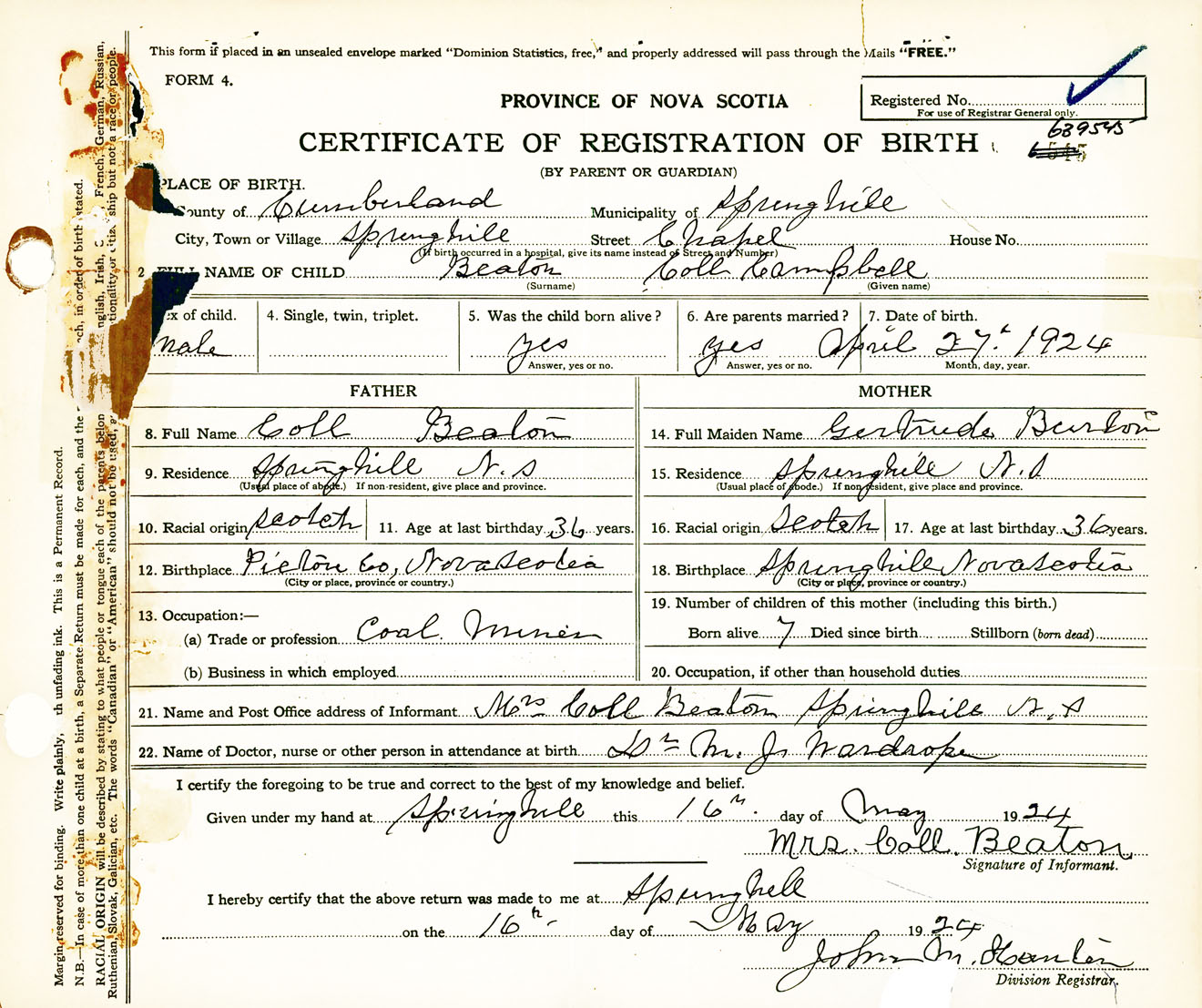 Male Birth Registration: Year: 1924 number: 63900545