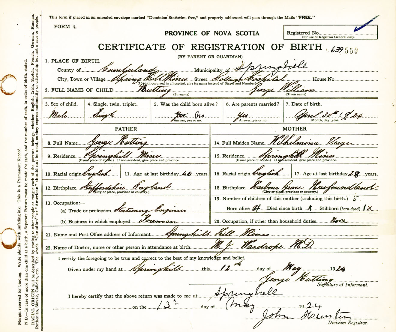 Male Birth Registration: Year: 1924 number: 63900550
