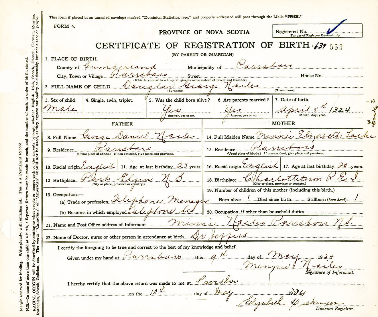 Male Birth Registration: Year: 1924 number: 63900556