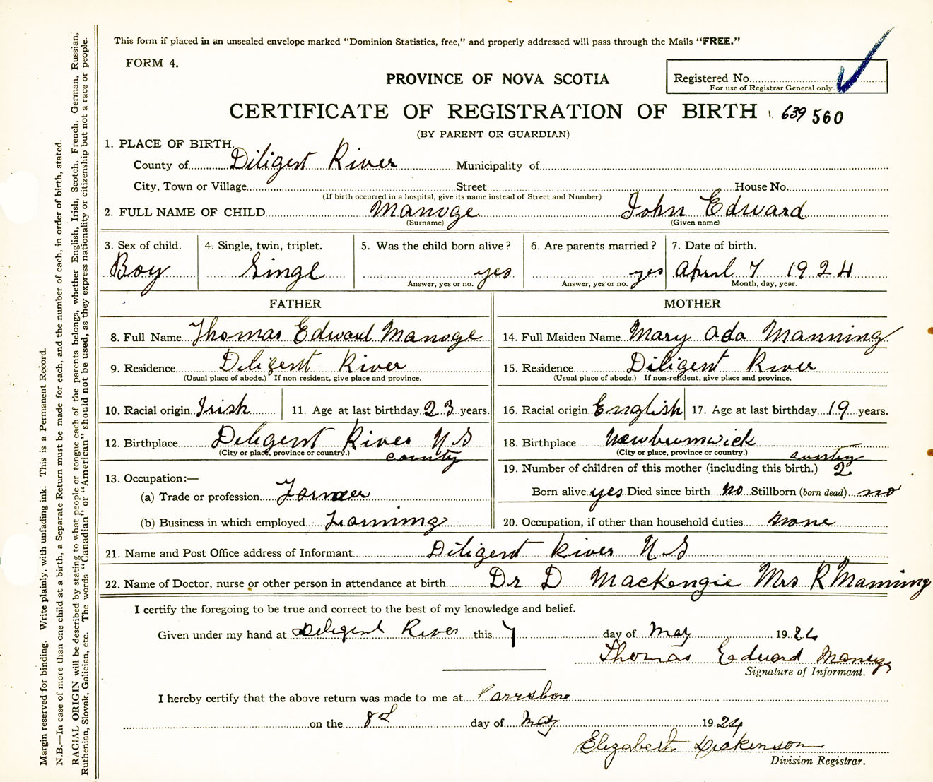 Male Birth Registration: Year: 1924 number: 63900560