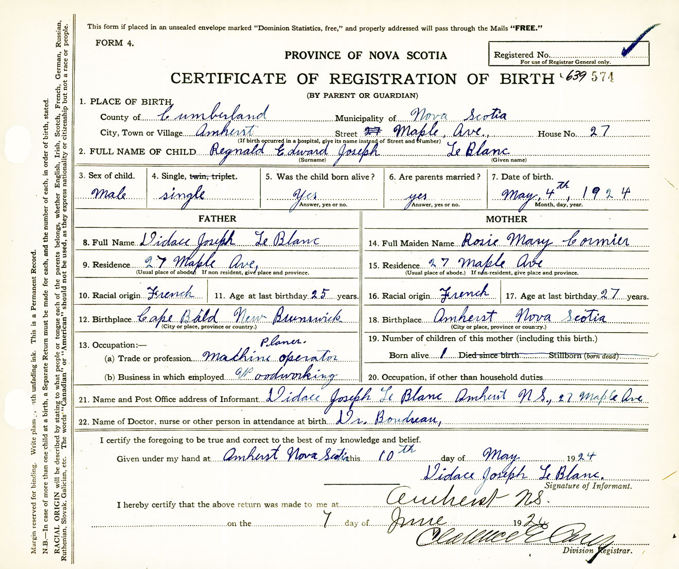Male Birth Registration: Year: 1924 number: 63900574