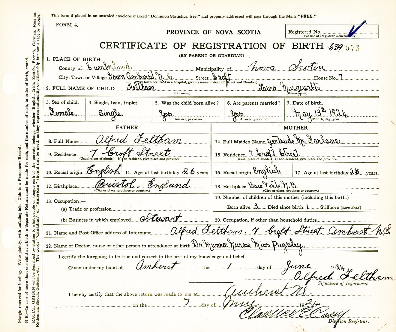 Female Birth Registration: Year: 1924 number: 63900576