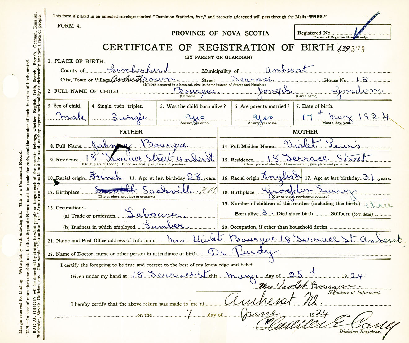 Male Birth Registration: Year: 1924 number: 63900579