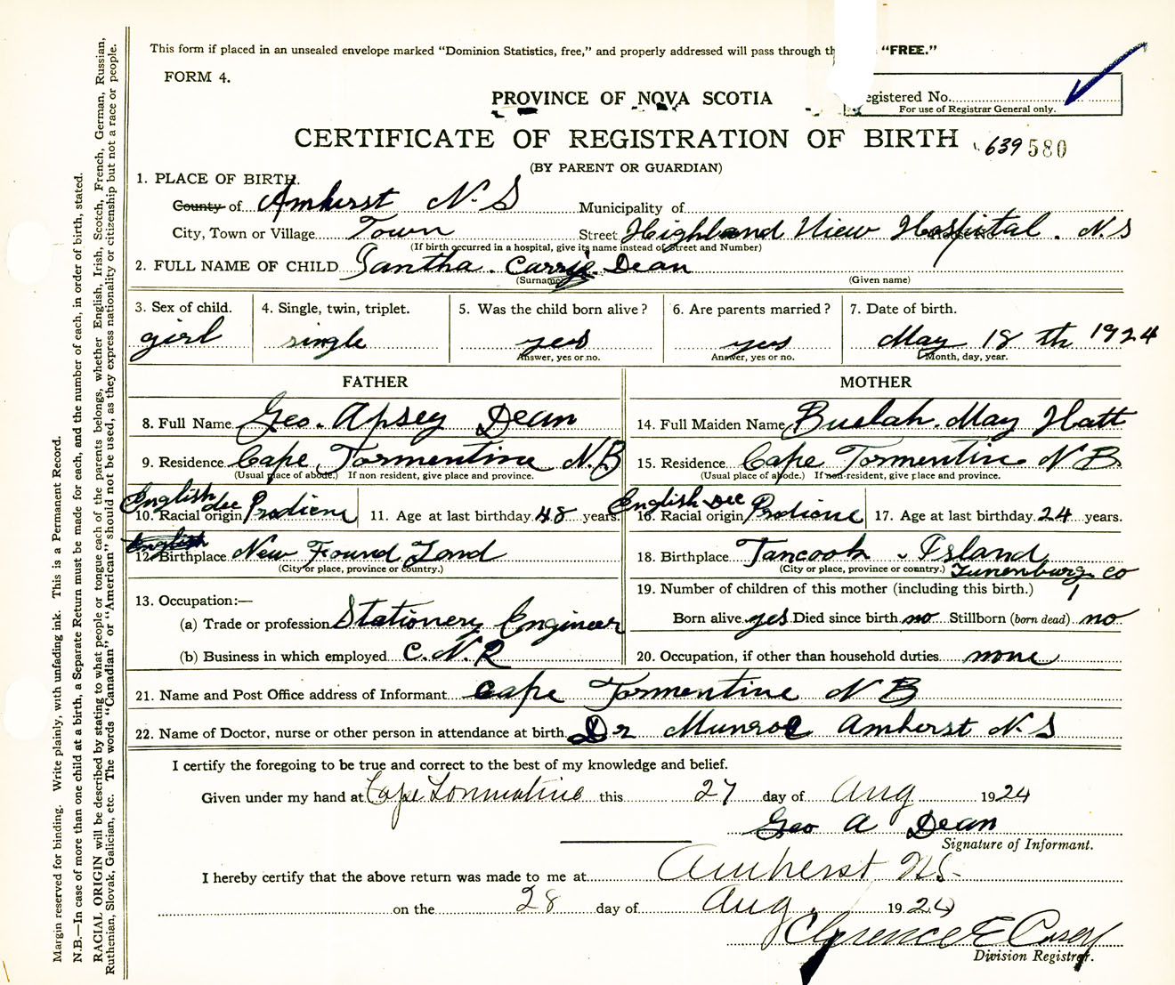 Female Birth Registration: Year: 1924 number: 63900580