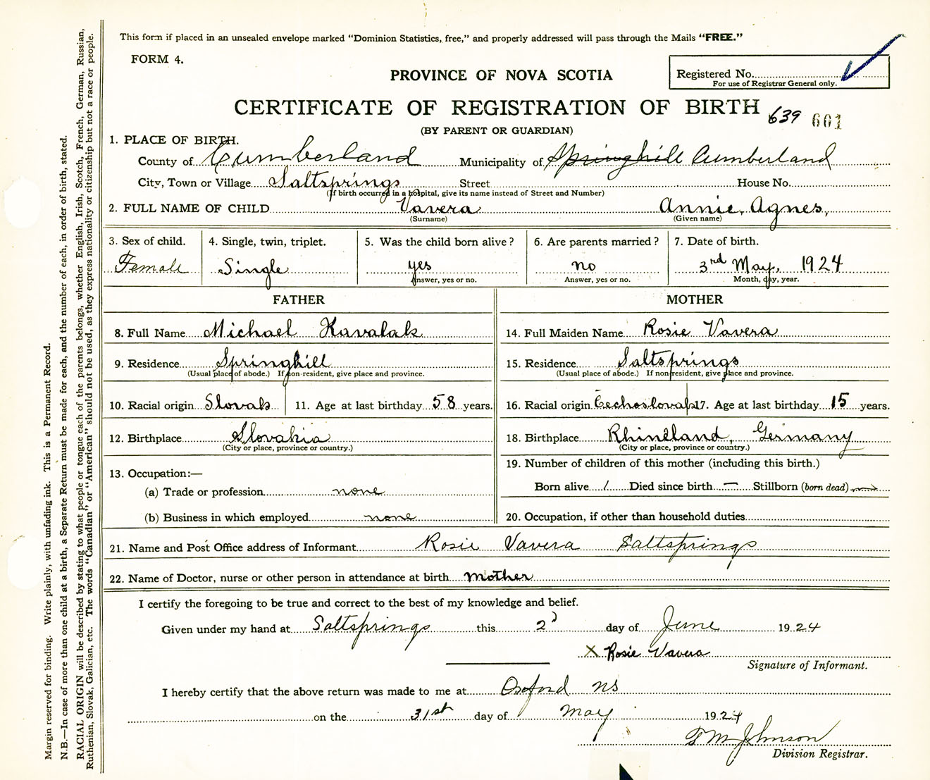 Female Birth Registration: Year: 1924 number: 63900601