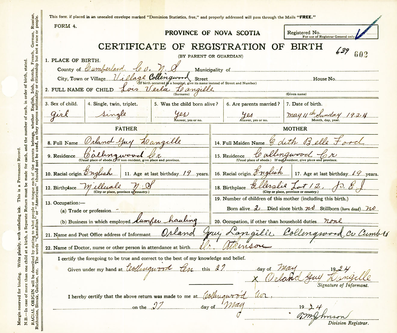 Female Birth Registration: Year: 1924 number: 63900602