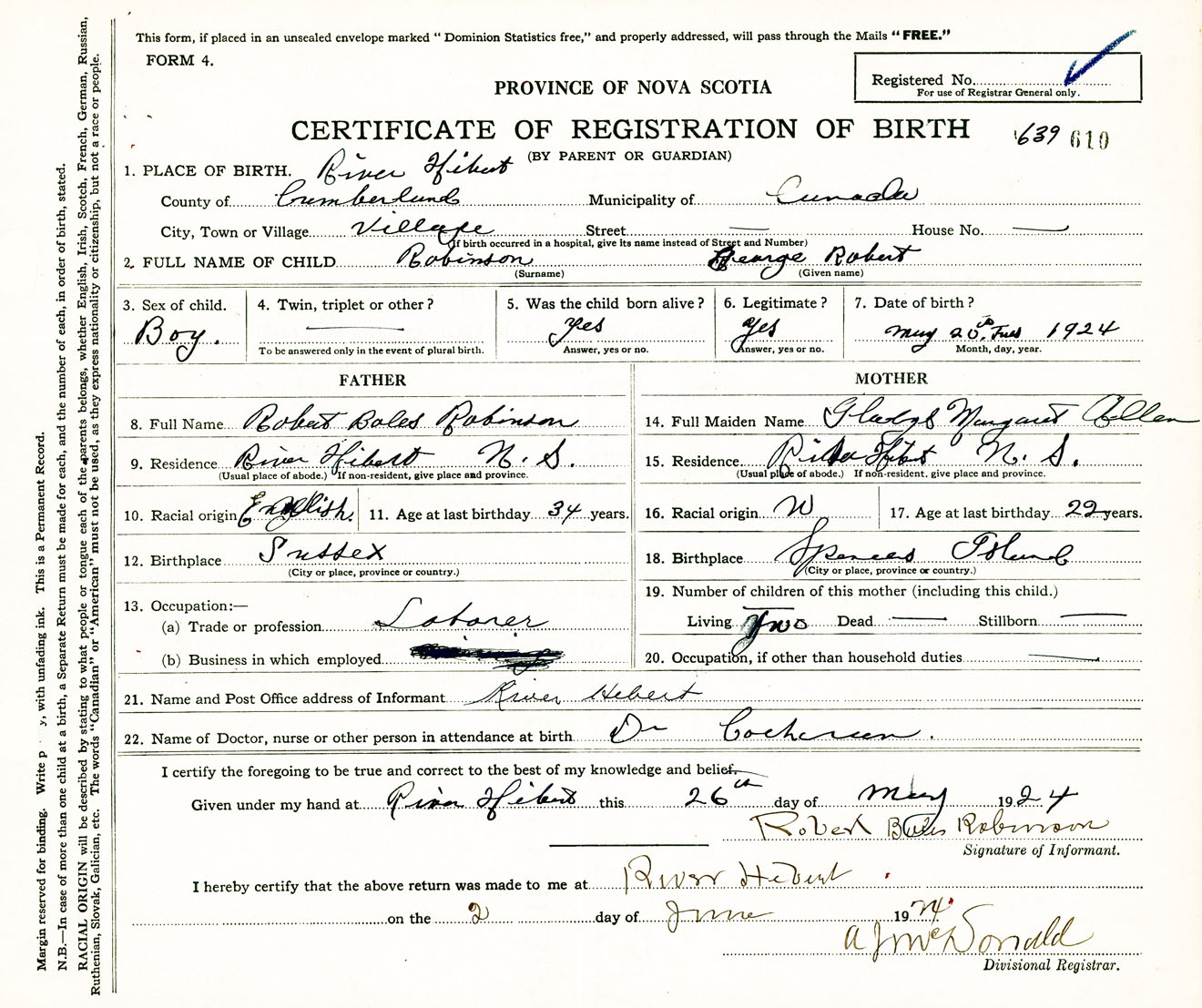 Male Birth Registration: Year: 1924 number: 63900610