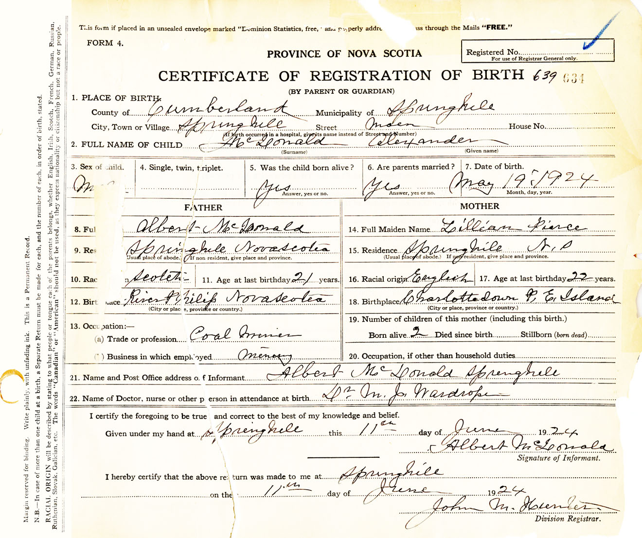 Male Birth Registration: Year: 1924 number: 63900634