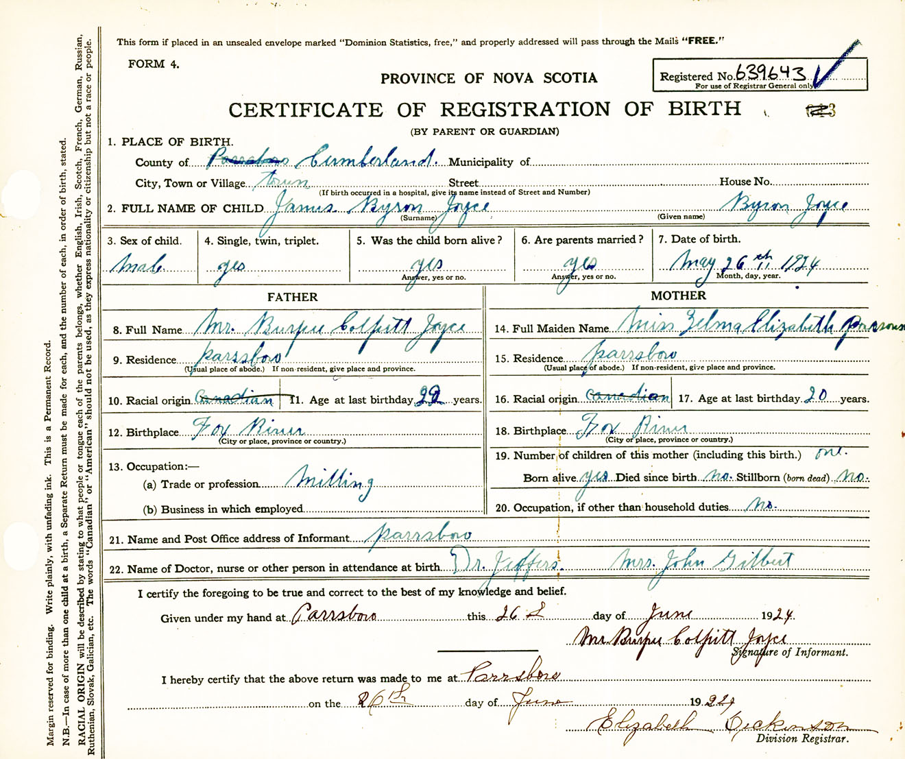 Male Birth Registration: Year: 1924 number: 63900643