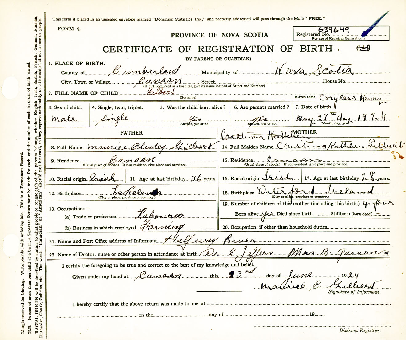 Male Birth Registration: Year: 1924 number: 63900649