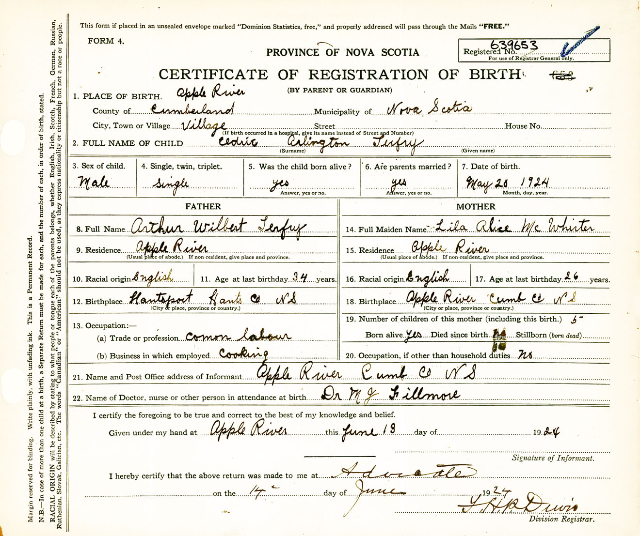 Male Birth Registration: Year: 1924 number: 63900653