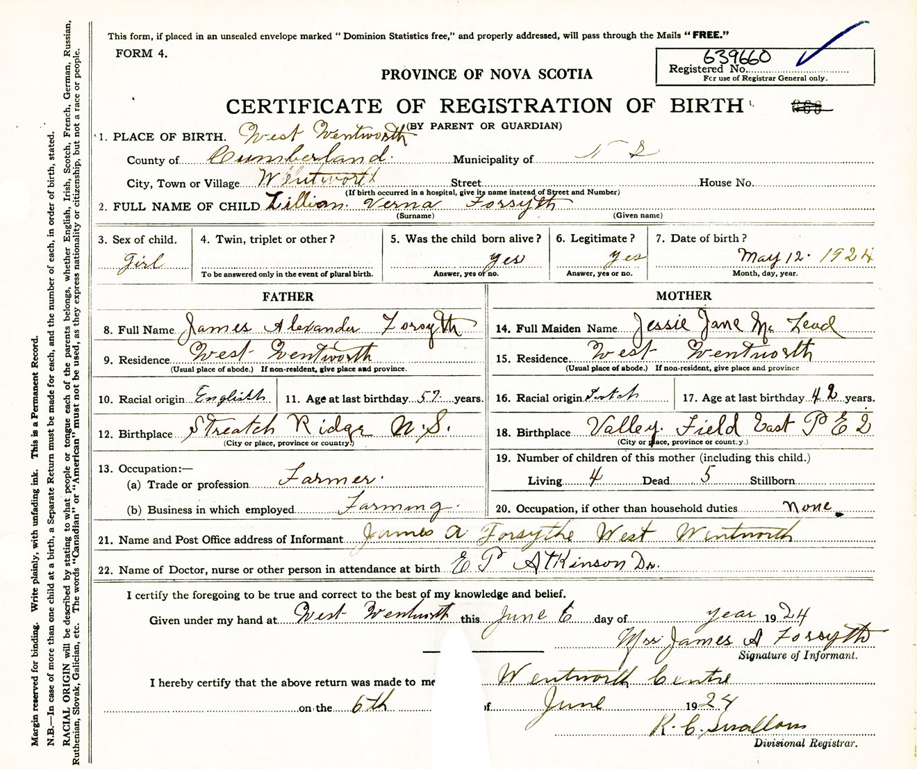 Female Birth Registration: Year: 1924 number: 63900660
