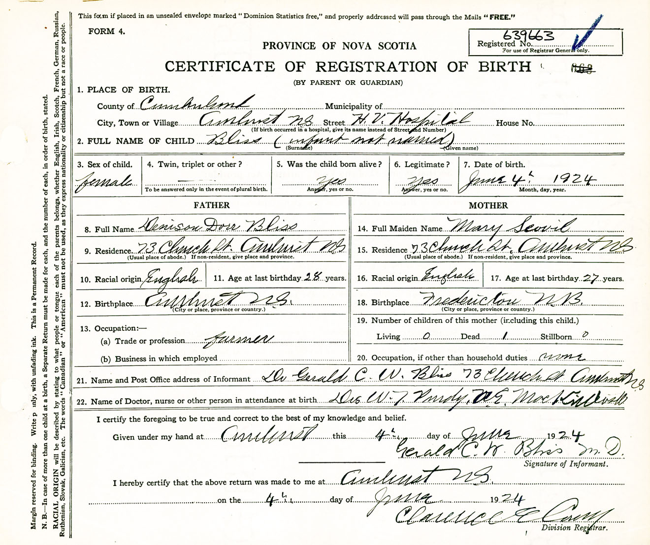 Female Birth Registration: Year: 1924 number: 63900663