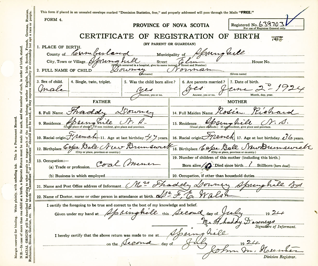 Male Birth Registration: Year: 1924 number: 63900703