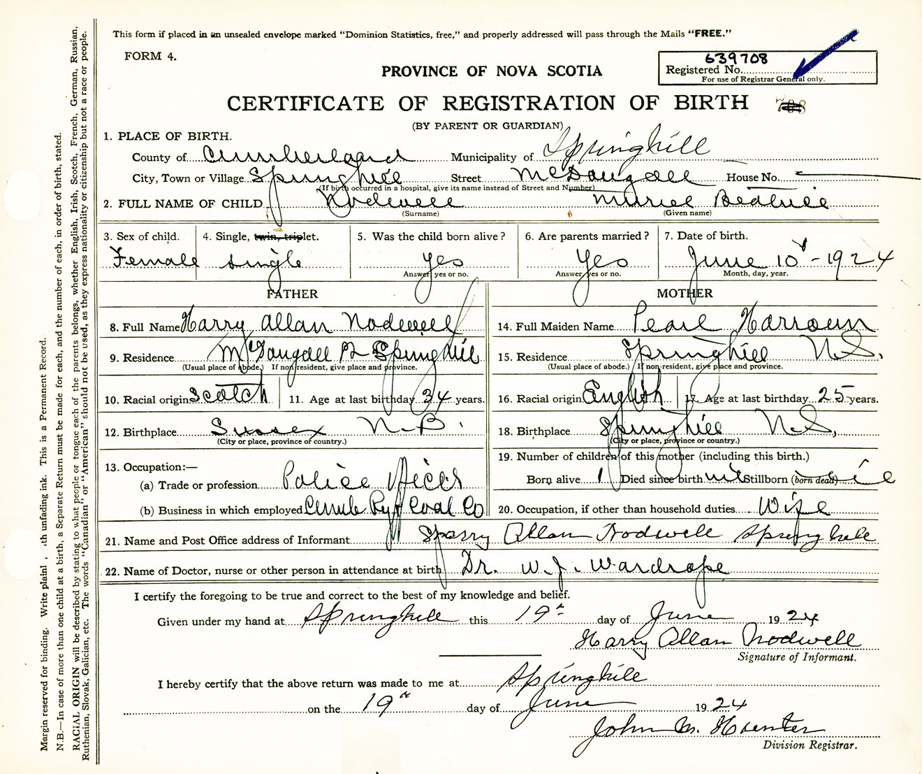 Female Birth Registration: Year: 1924 number: 63900708