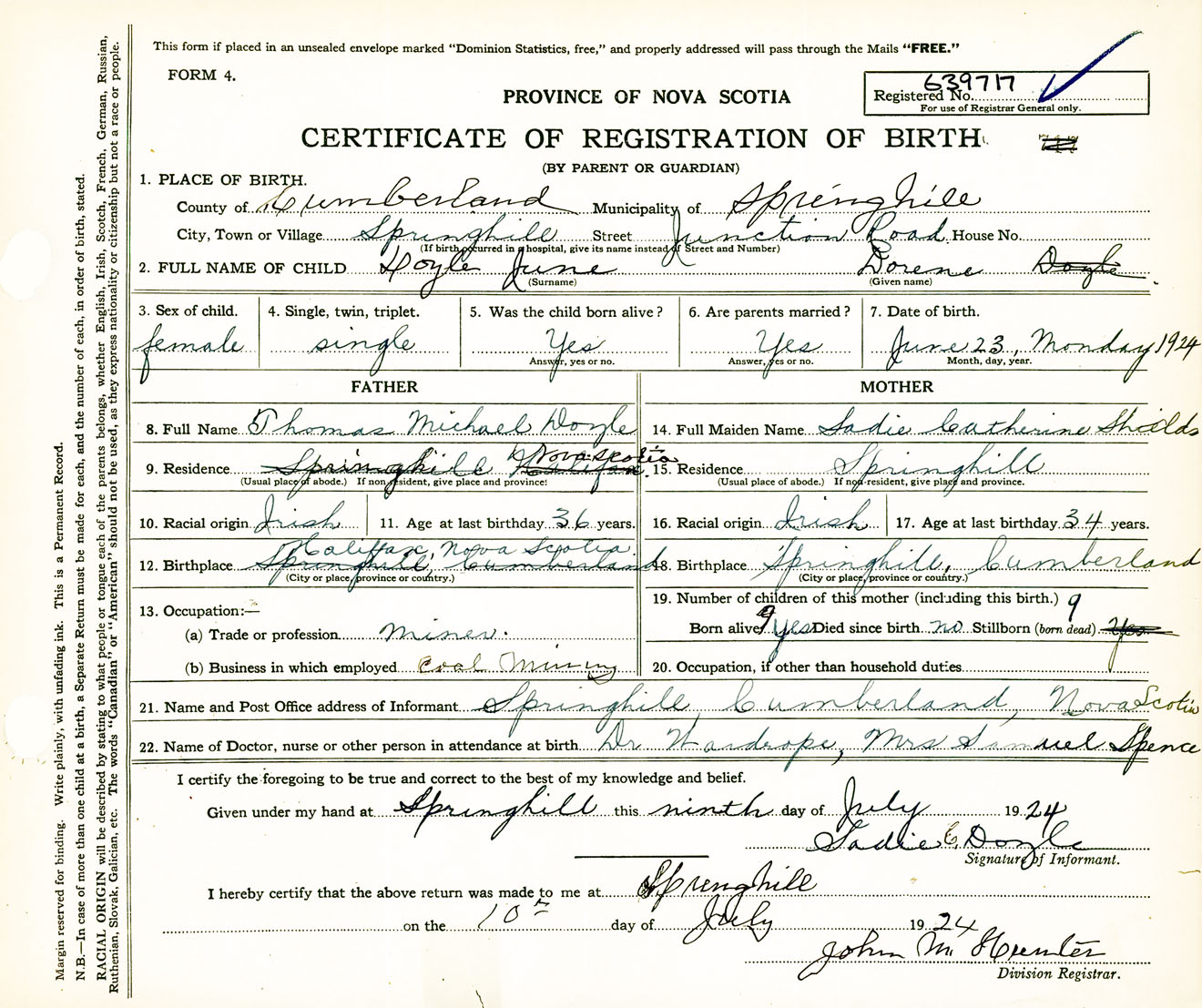 Female Birth Registration: Year: 1924 number: 63900717