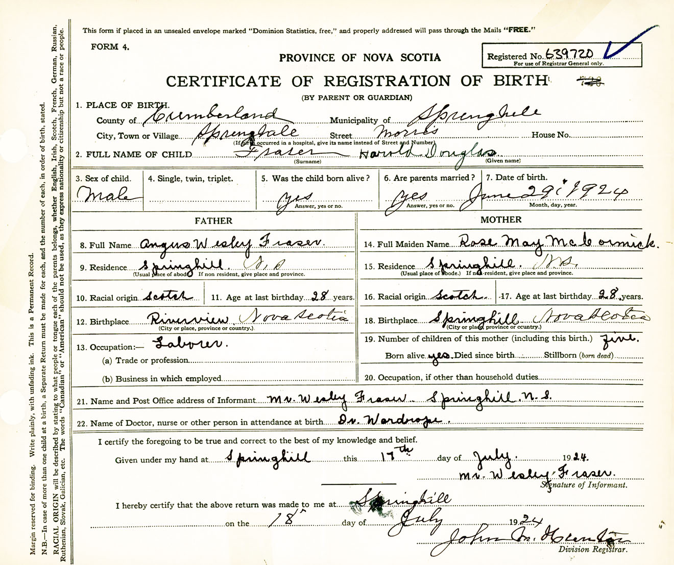 Male Birth Registration: Year: 1924 number: 63900720