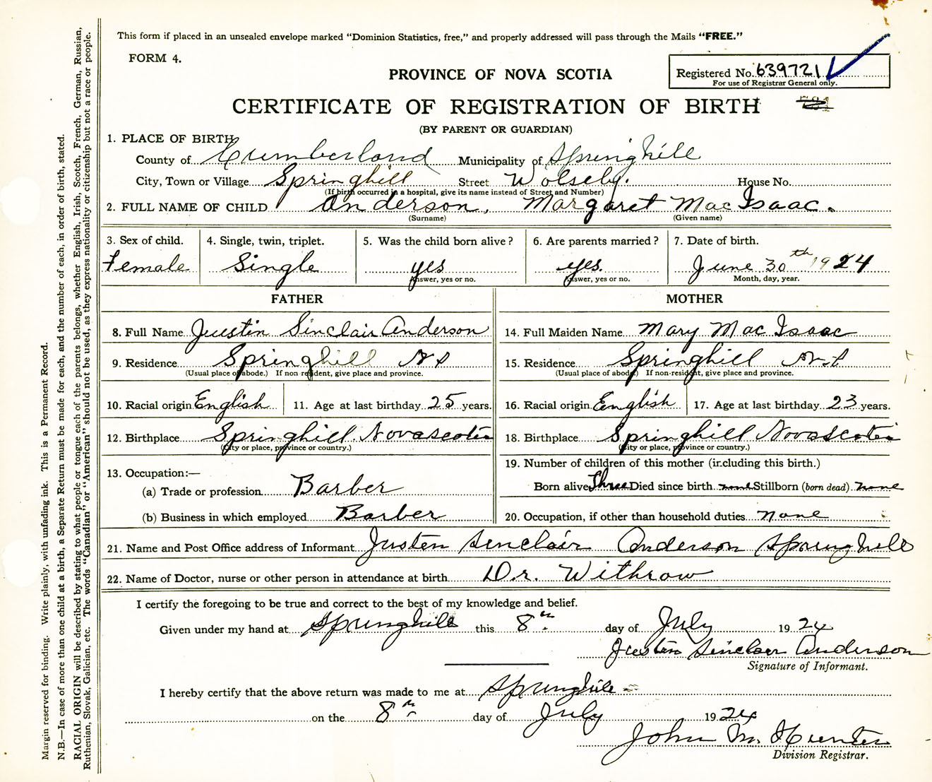 Female Birth Registration: Year: 1924 number: 63900721