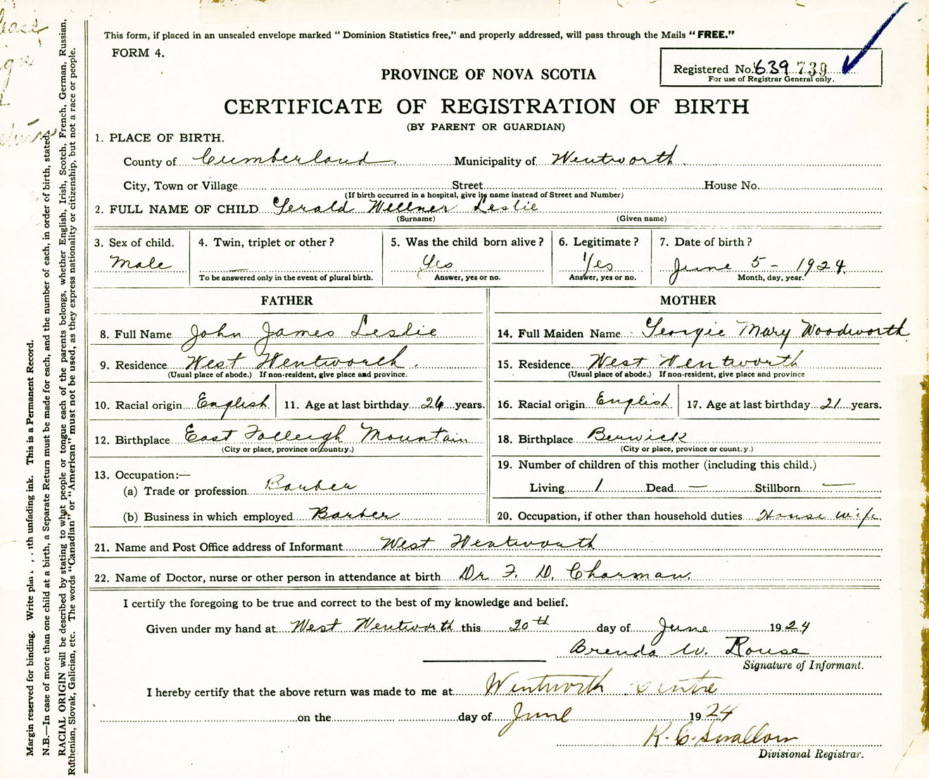 Male Birth Registration: Year: 1924 number: 63900739