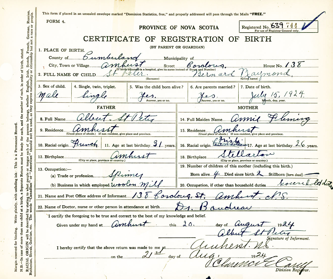 Male Birth Registration: Year: 1924 number: 63900744
