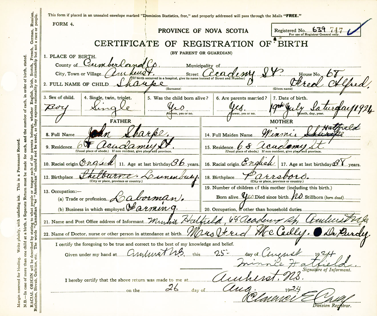 Male Birth Registration: Year: 1924 number: 63900747