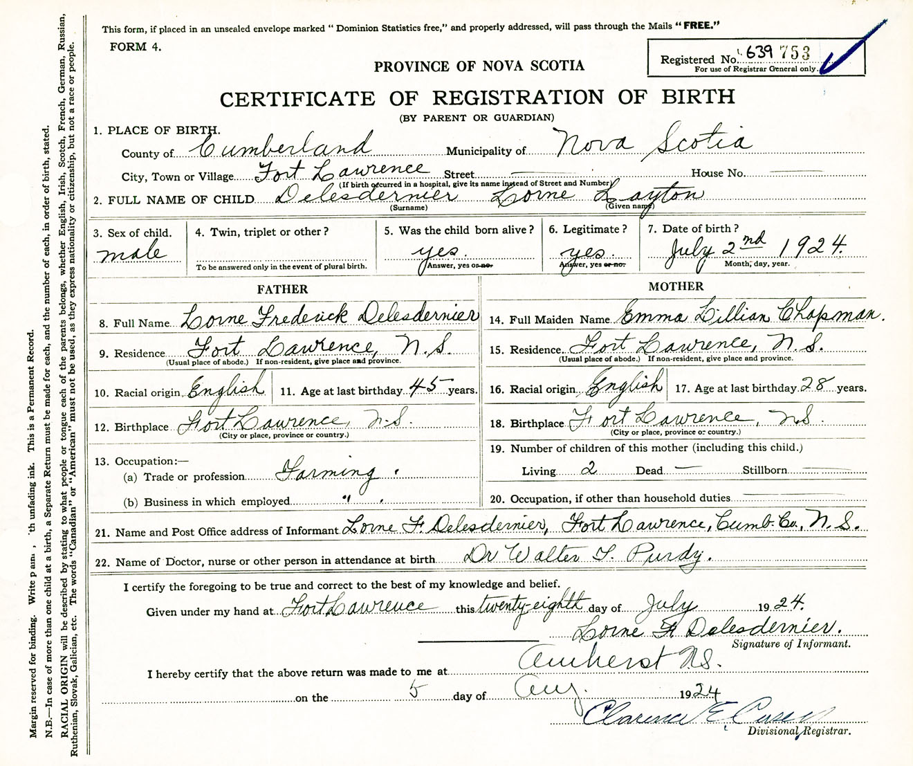 Male Birth Registration: Year: 1924 number: 63900753