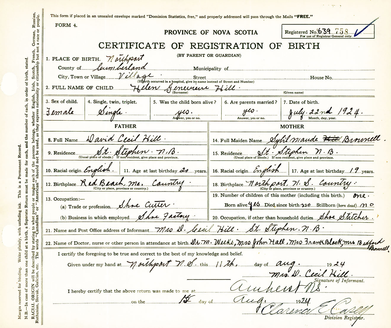 Female Birth Registration: Year: 1924 number: 63900758