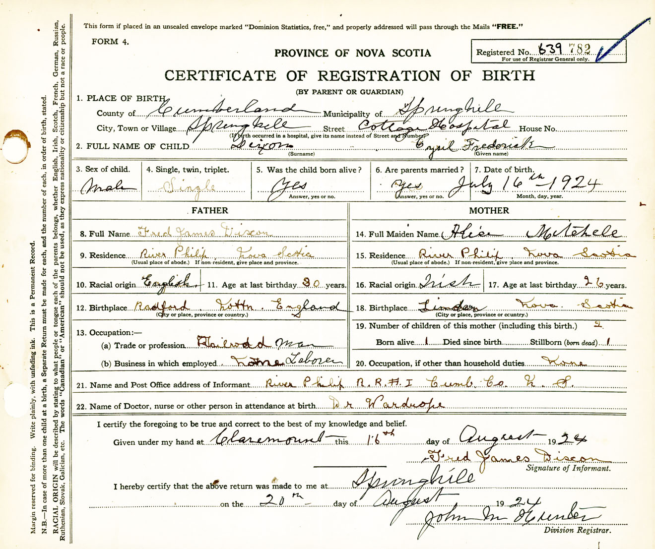 Male Birth Registration: Year: 1924 number: 63900782