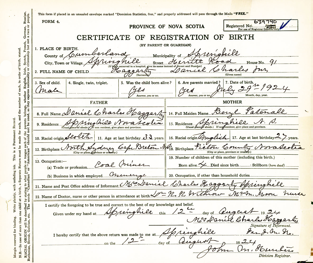 Male Birth Registration: Year: 1924 number: 63900790
