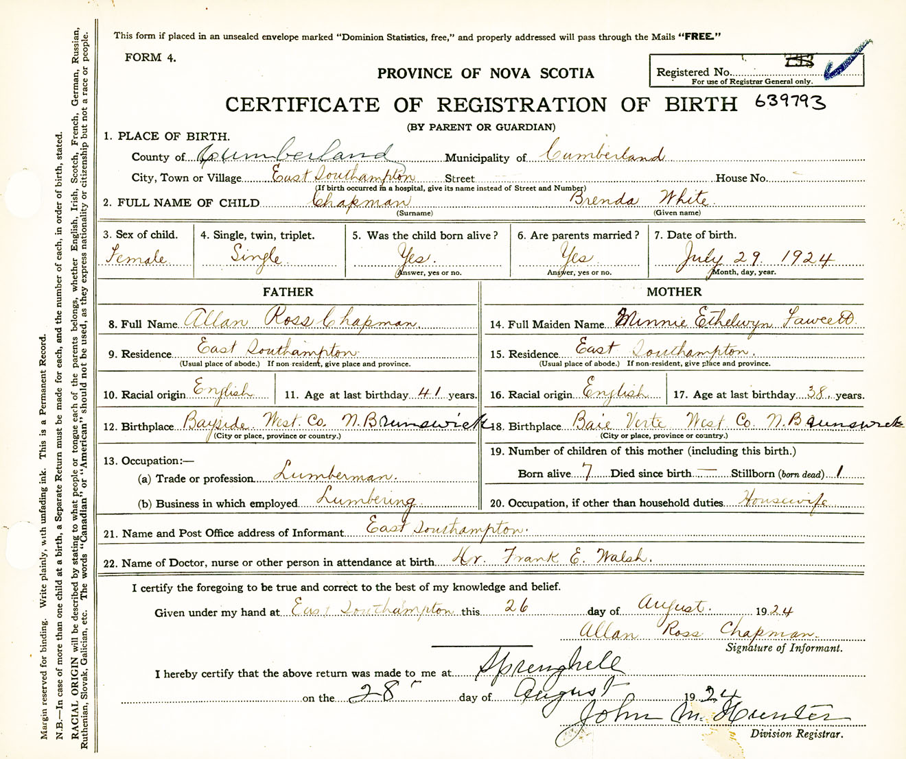 Female Birth Registration: Year: 1924 number: 63900793