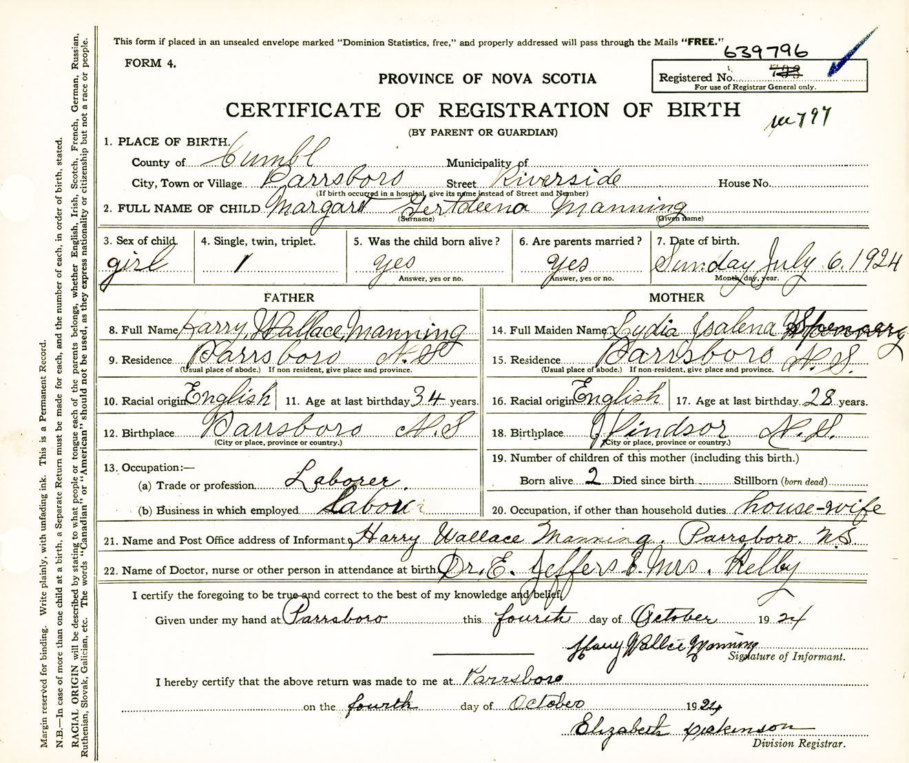 Female Birth Registration: Year: 1924 number: 63900796
