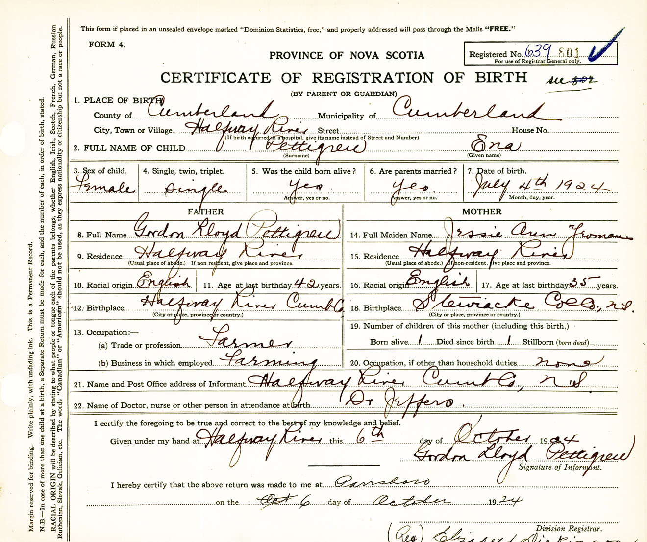 Female Birth Registration: Year: 1924 number: 63900801