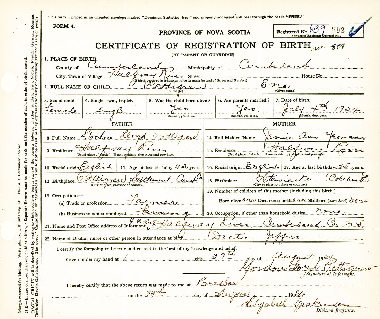 Female Birth Registration: Year: 1924 number: 63900802