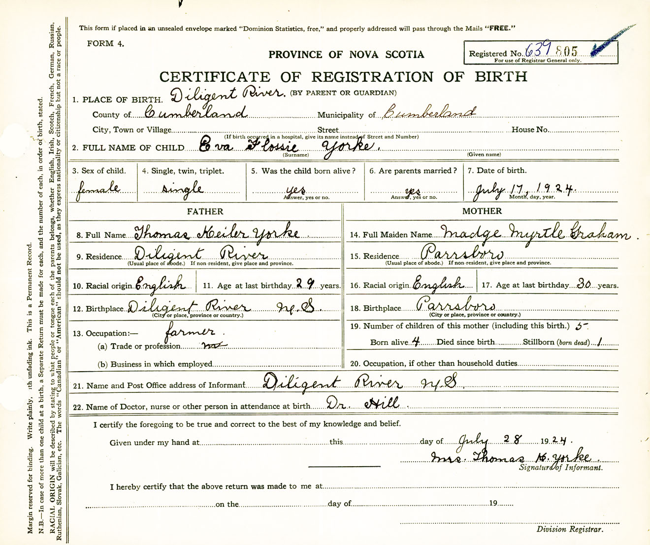 Female Birth Registration: Year: 1924 number: 63900805