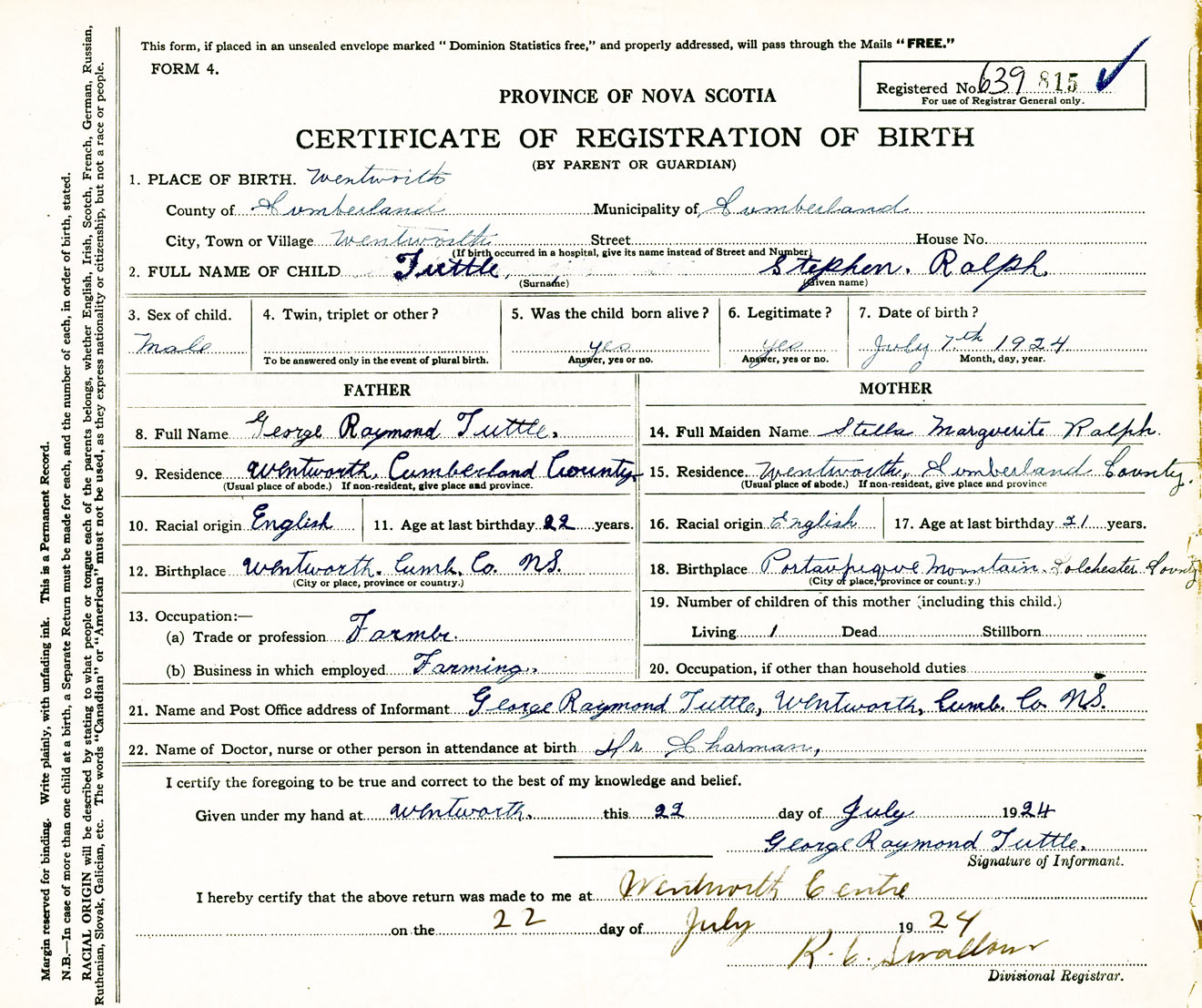 Male Birth Registration: Year: 1924 number: 63900815