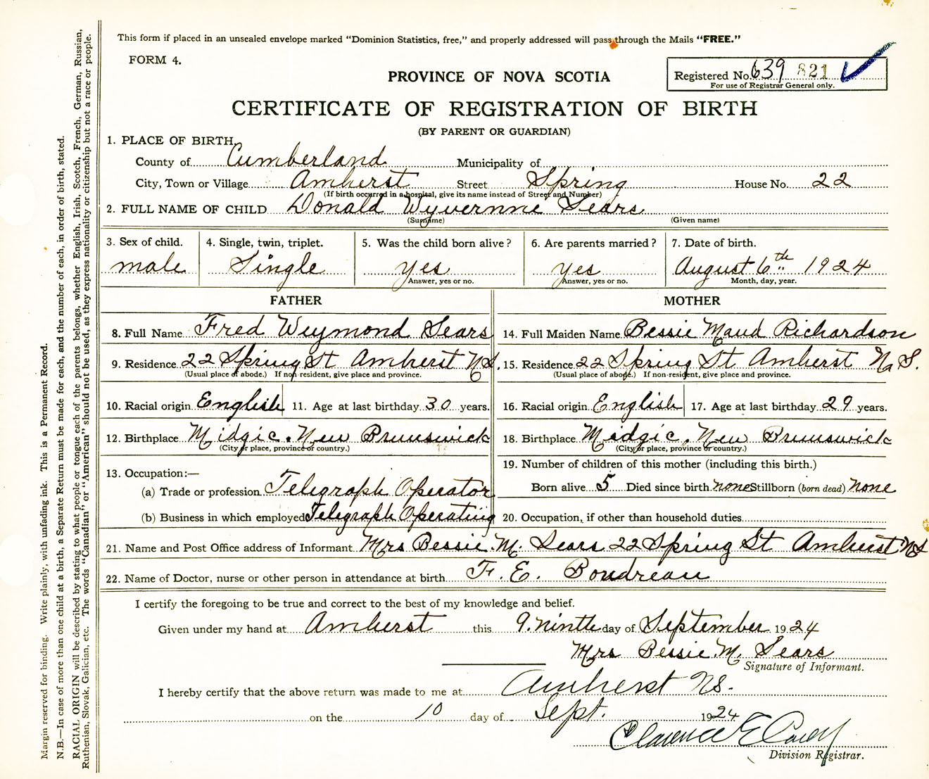 Male Birth Registration: Year: 1924 number: 63900821
