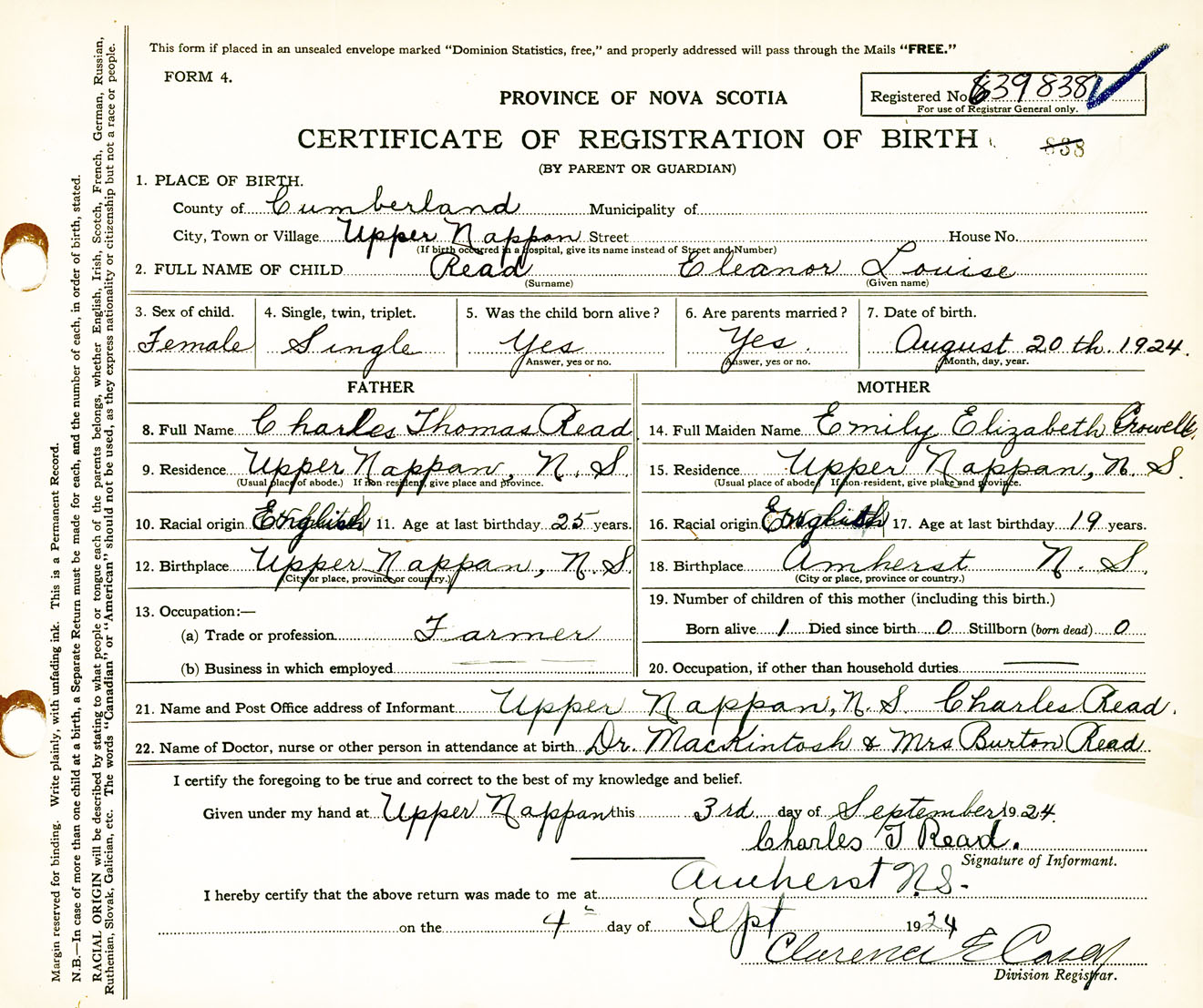 Female Birth Registration: Year: 1924 number: 63900838