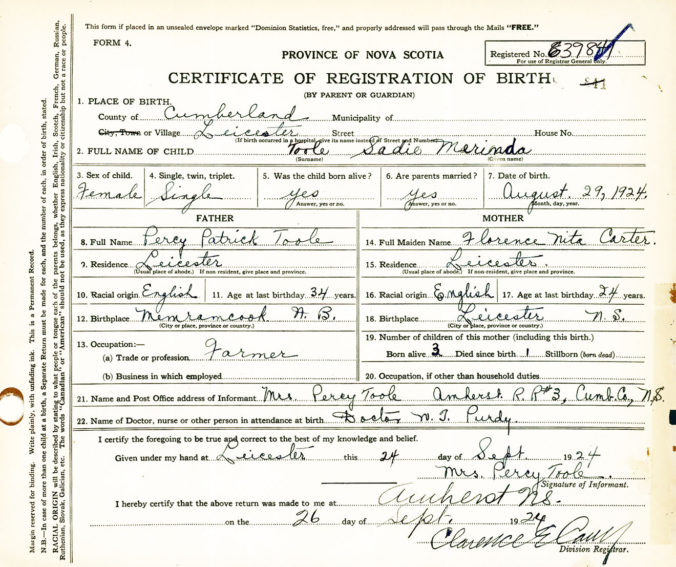 Female Birth Registration: Year: 1924 number: 63900841