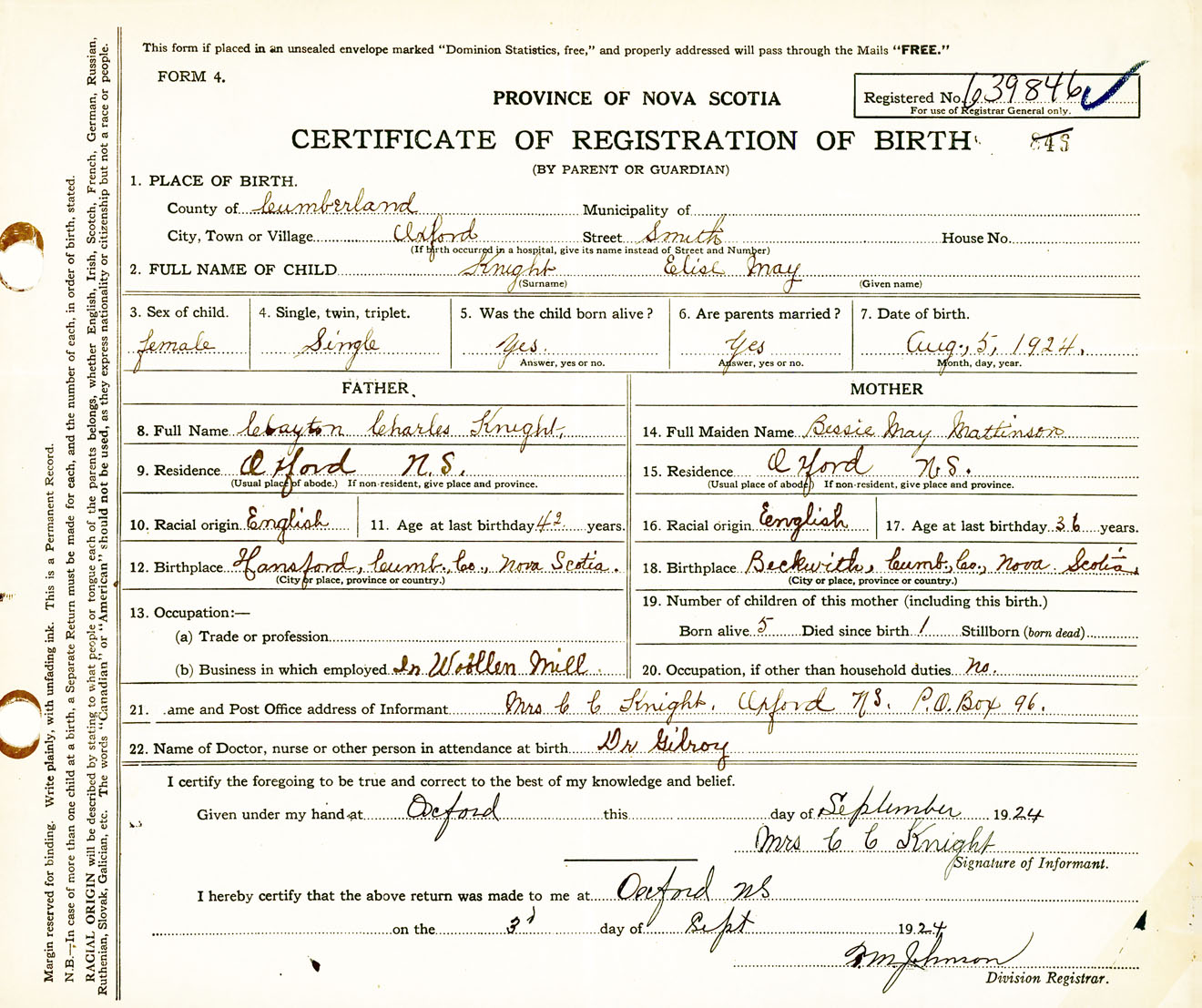 Female Birth Registration: Year: 1924 number: 63900846