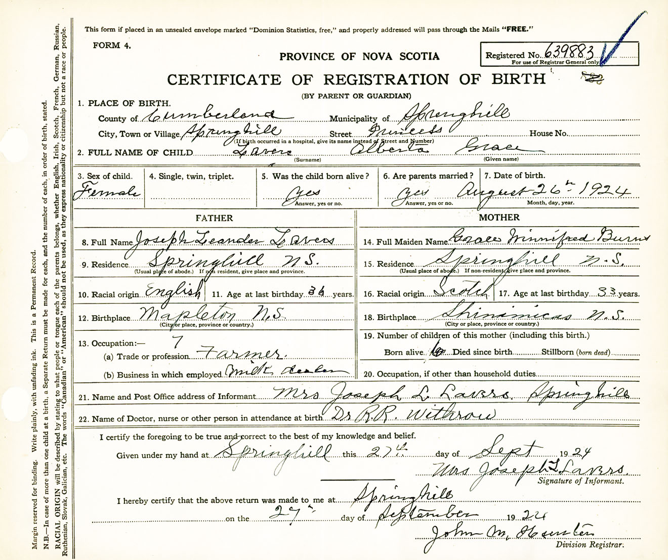 Female Birth Registration: Year: 1924 number: 63900883