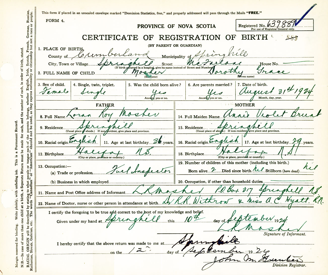 Female Birth Registration: Year: 1924 number: 63900889