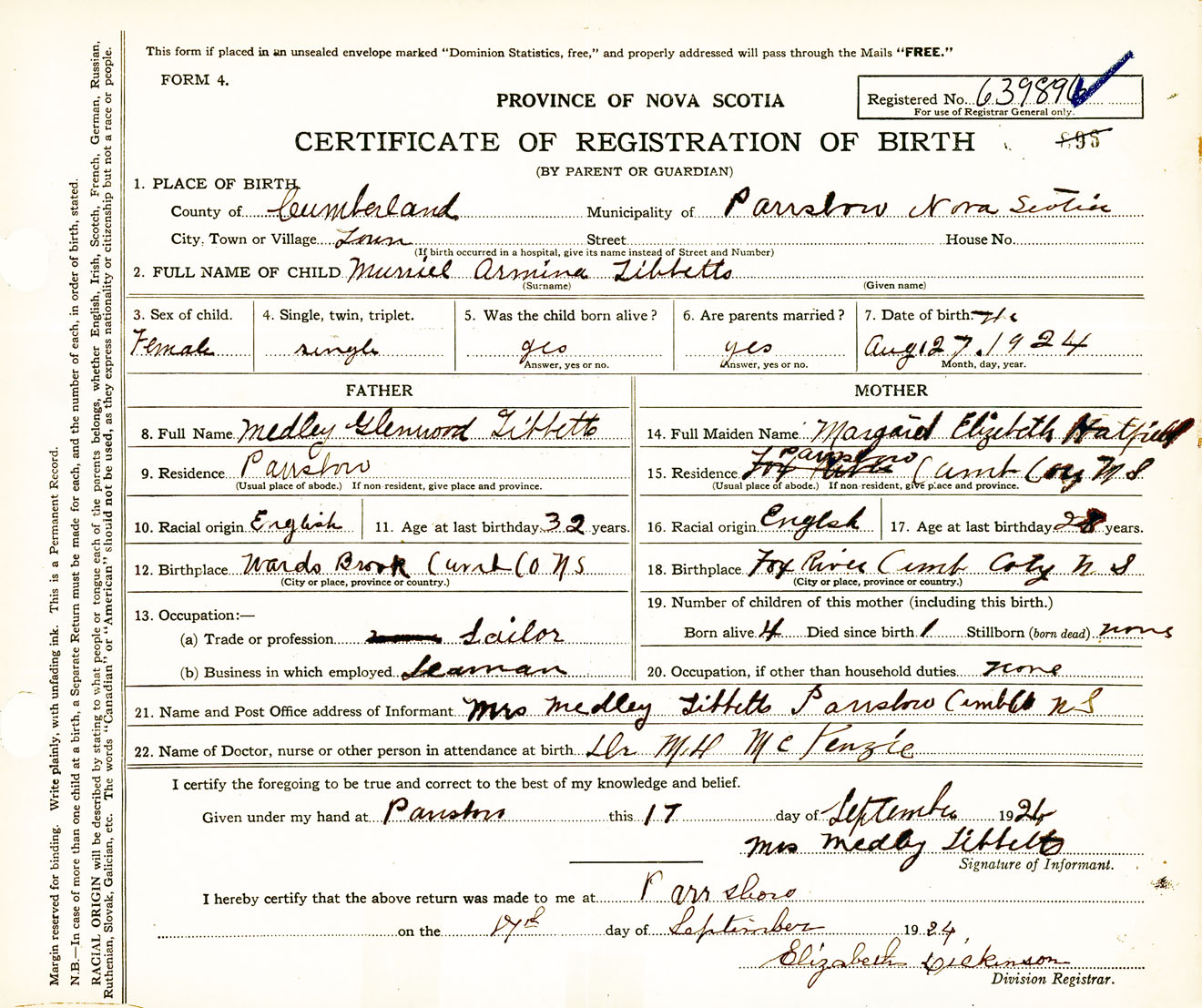 Female Birth Registration: Year: 1924 number: 63900896