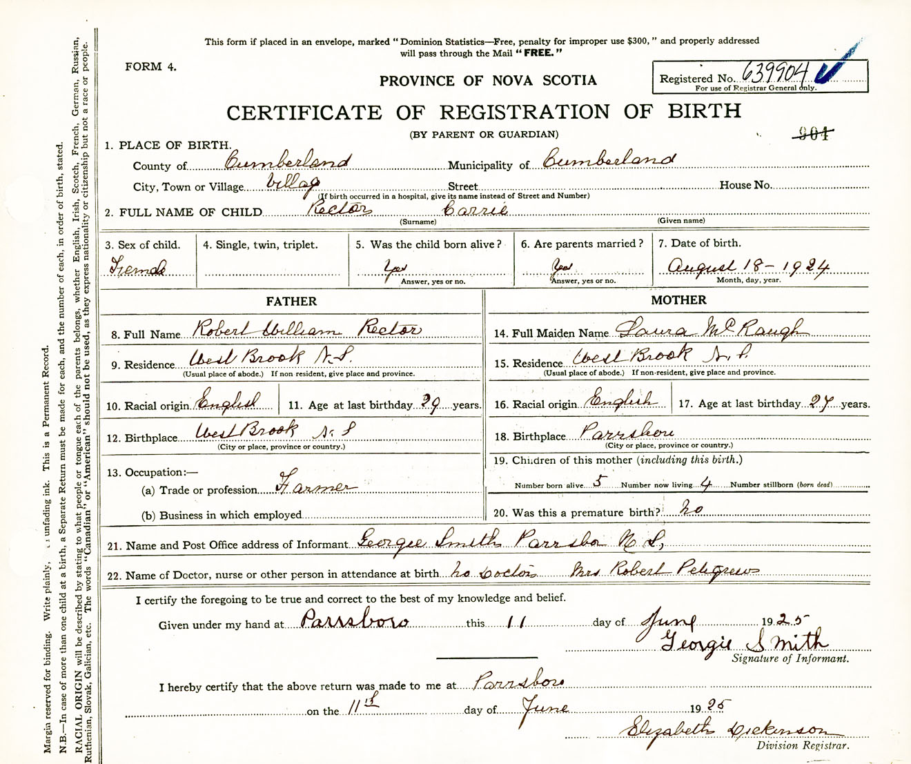 Female Birth Registration: Year: 1924 number: 63900904