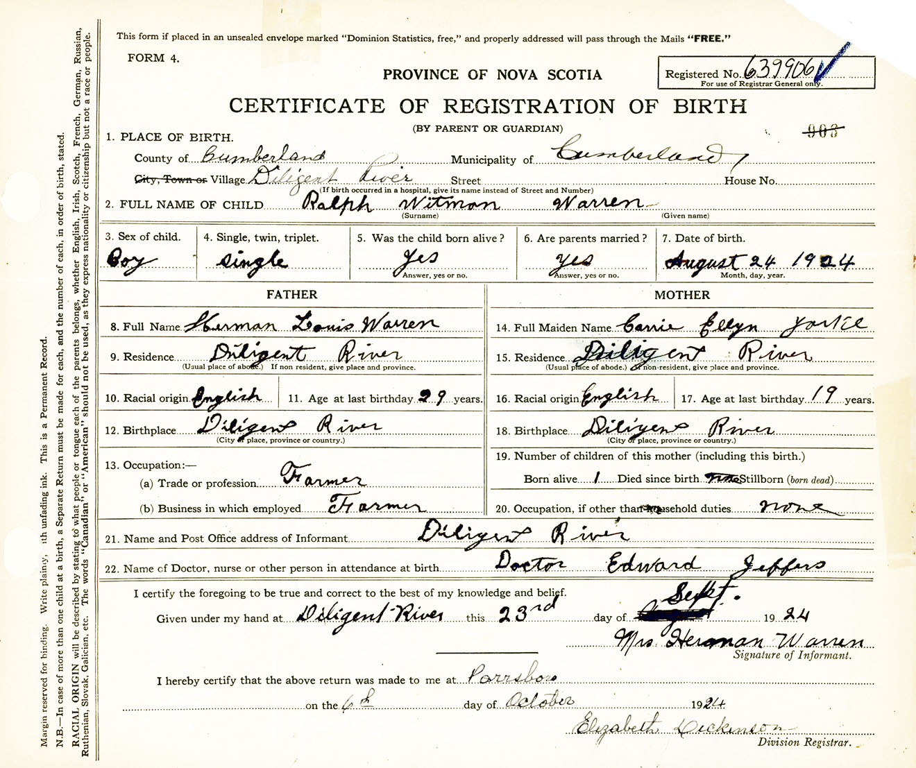 Male Birth Registration: Year: 1924 number: 63900906
