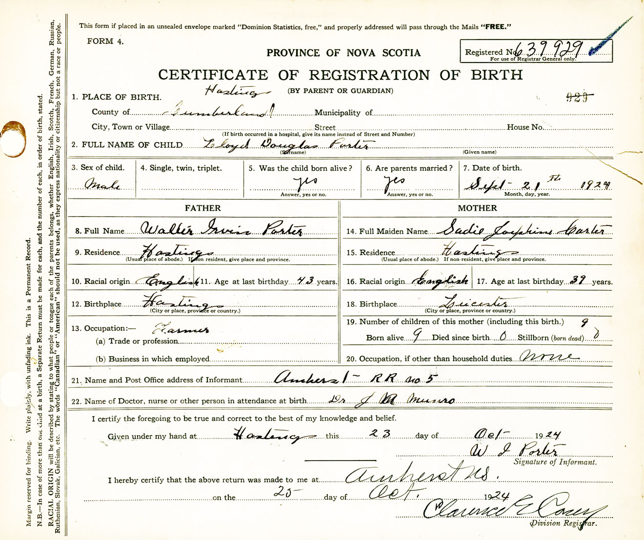 Male Birth Registration: Year: 1924 number: 63900929