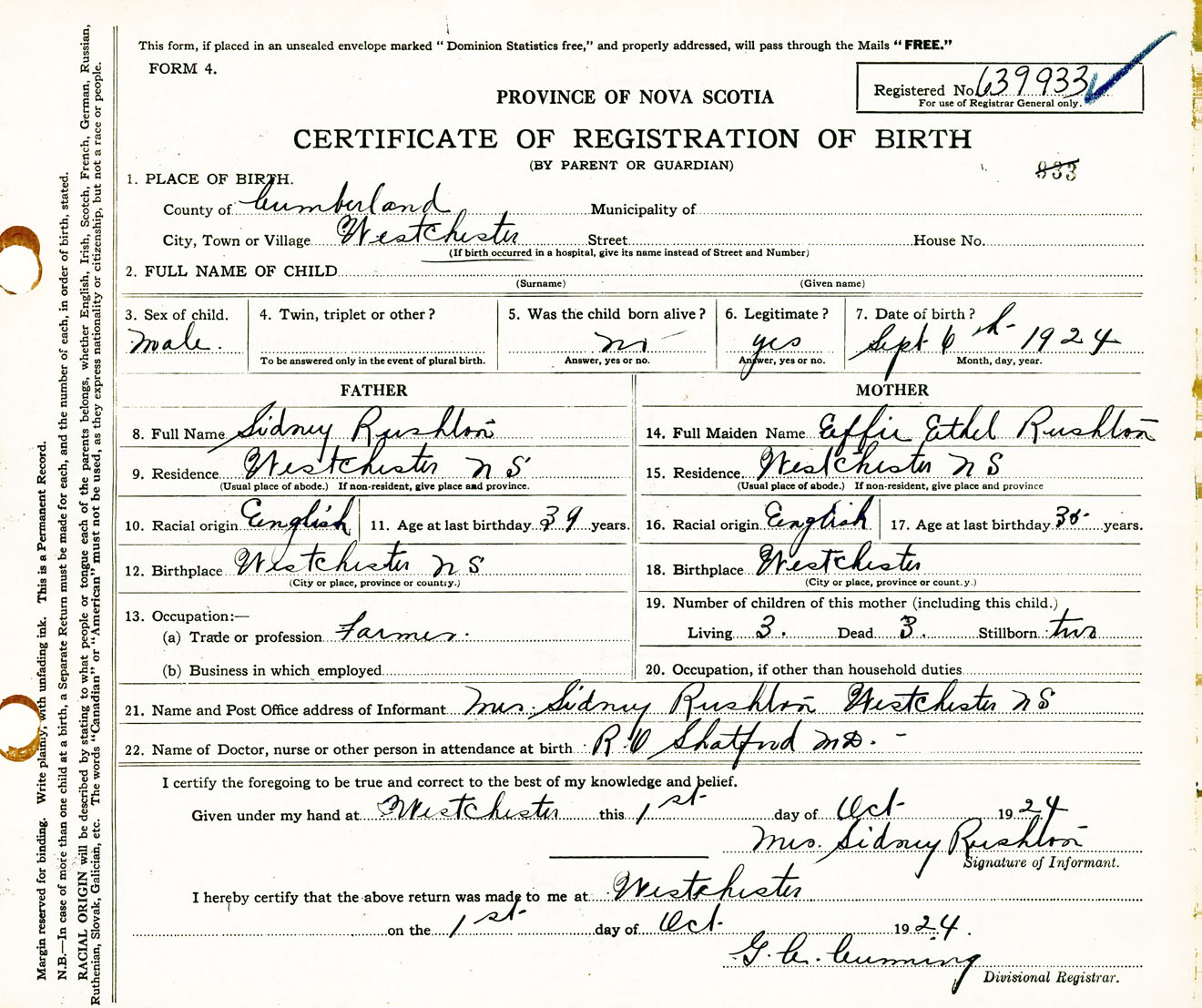 Male Birth Registration: Year: 1924 number: 63900933