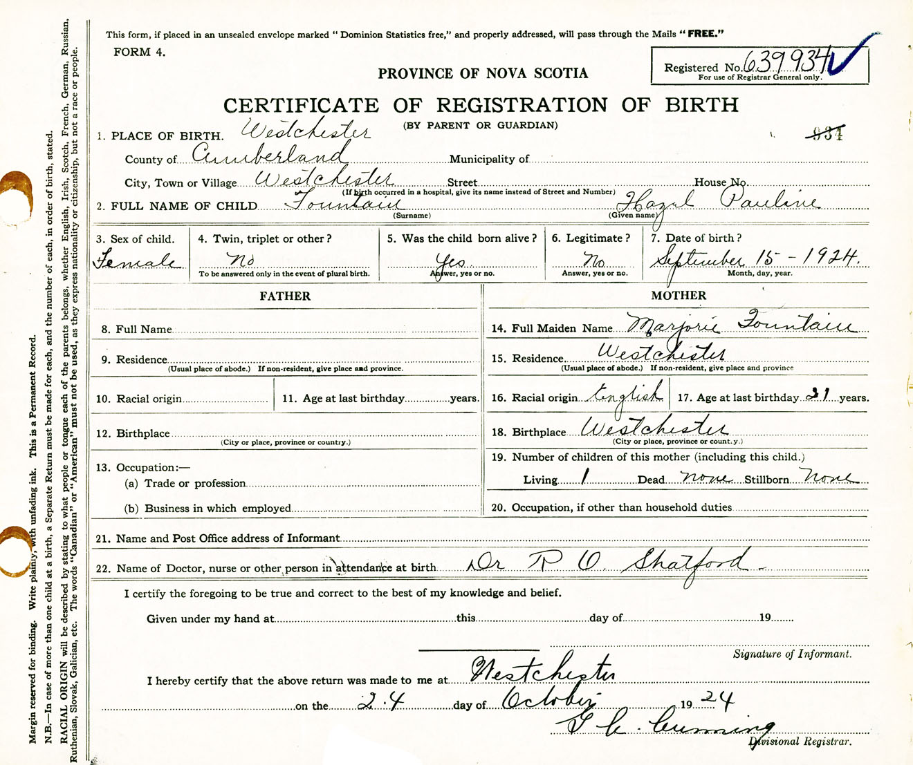 Female Birth Registration: Year: 1924 number: 63900934